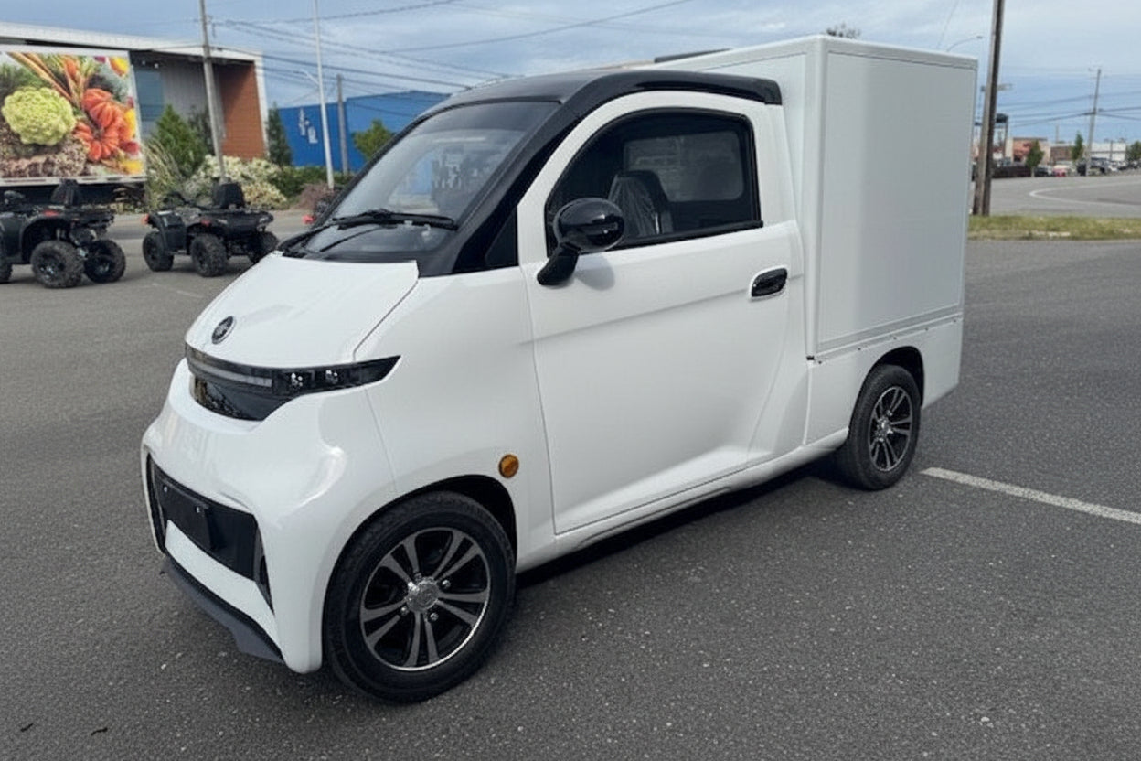 Le Ecolo Cycle ET4 Cruise Connect Cube à 4 roues est entièrement équipé, et conçu pour une utilisation toute l'année. Sa cabine 4 saisons comprend un chauffage de 800W, un toit ouvrant, une climatisation, un système d'essuie-glace/lave-glace, et des pneus d'hiver (En option) pour une meilleure traction par temps froid.