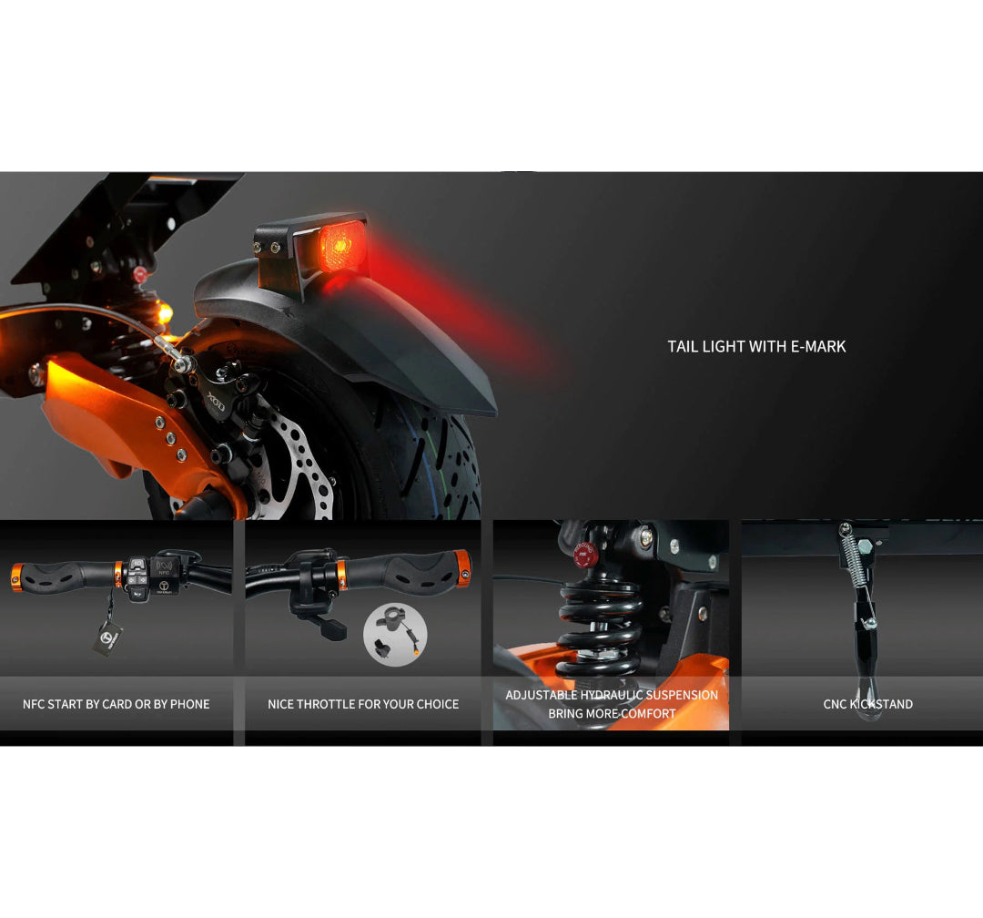 Un groupe motopropulseur de (60 Volts) alimentant deux moteurs de (1500 Watts) pour une puissance soutenue combinée de (3000 Watts) (4800 Watts en pointe). C’est suffisant pour vous amener à 85 Km/h (52 Mph) Plus important encore, il vous permettra de gravir pratiquement toutes les collines que vous rencontrerez. La batterie de (30Ah) vous offre une autonomie allant jusqu’à 90 Km par charge.