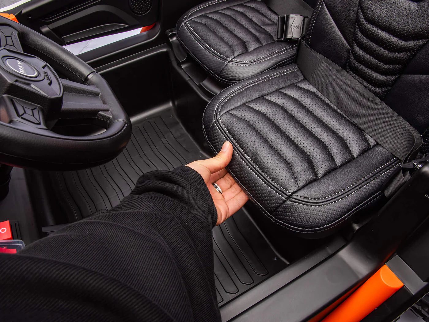 Le Buggy UTV Premium MegaTrek XXL est conçu pour les enfants en quête d'aventures tout-terrain et les parents exigeants en matière de sécurité, de robustesse et de confort. Véritable petit camion électrique biplace, il est équipé de sièges réglables en similicuir, de ceintures de sécurité et supporte un poids maximal de 75 Kg, offrant ainsi suffisamment d'espace pour accueillir des frères et sœurs, voire un parent. Grâce à ses quatre puissants moteurs (24 Volts) (4x350 Watts), le Premium MegaTrek XXL est capable d'affronter tous les terrains et garantit des sensations fortes à chaque sortie. Son design ergonomique assure une conduite fluide et maîtrisée. De plus, ses pneus en caoutchouc EVA résistant offrent une excellente adhérence, idéale pour les aventures en plein air.