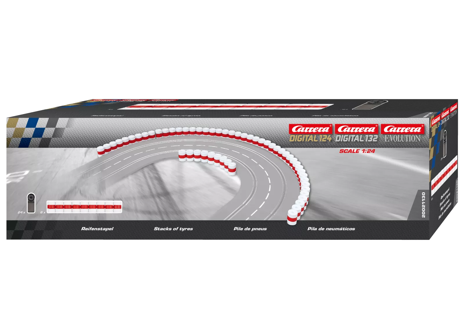 The tire stacks provide an even more authentic ambiance and are available in 1:24 scale. They are therefore perfectly suited to the Carrera DIGITAL 124, Carrera DIGITAL 132 and Carrera EVOLUTION circuits. Included: 24 stands and six tire elements, each with nine tire stacks and three tires per stack. Tire chains can be used anywhere.