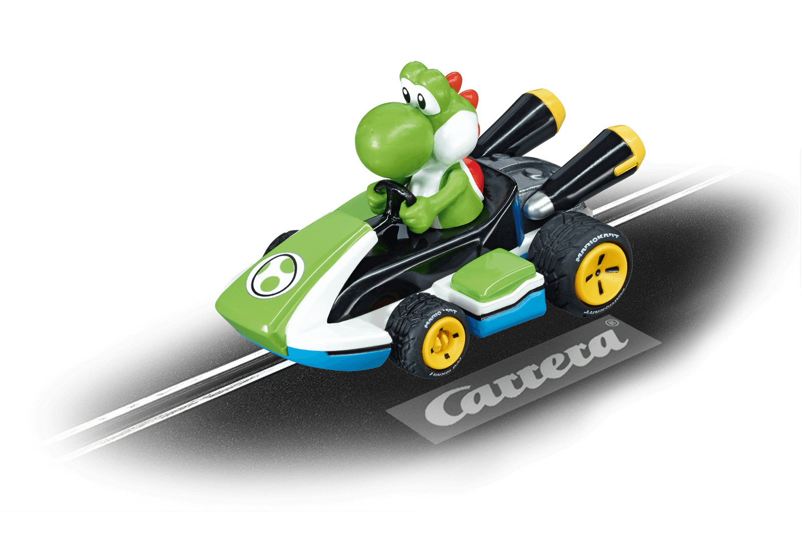 Alongside his friend Mario, Yoshi enjoys great adventures and exciting races against his opponents in the game “Nintendo Mario Kart™ 8”. The little dragon feels comfortable behind the wheel of his car and shows that he has what it takes to become a real racing driver. Will Yoshi be the first to cross the finish line on your Carrera circuit?