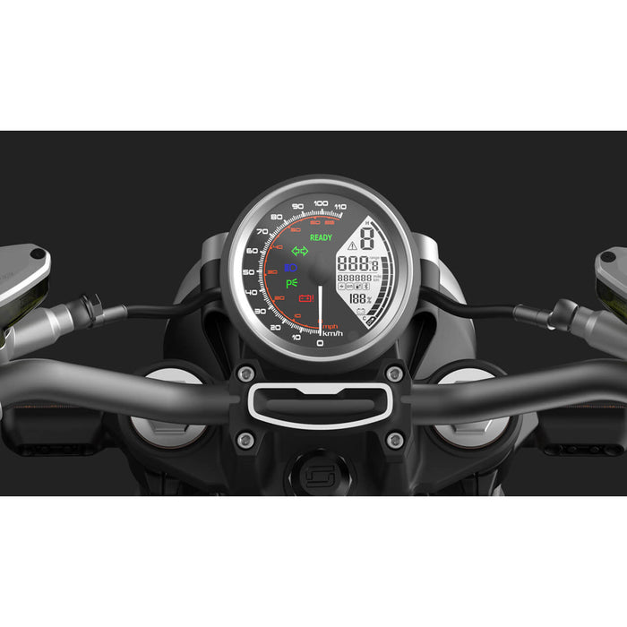 Un écran combiné analogique/numérique est inclus dans un tableau de bord de style rétro. Il affiche la vitesse actuelle et les codes d’erreur, le kilométrage total, la température du contrôleur, le courant de sortie en temps réel, l’état de charge de la batterie, la distance par charge, la distance restante, la température ambiante et l’heure actuelle.